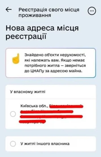 Далі необхідно вибрати адресу нової реєстрації – власне житло чи житло іншого власника.