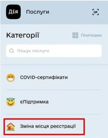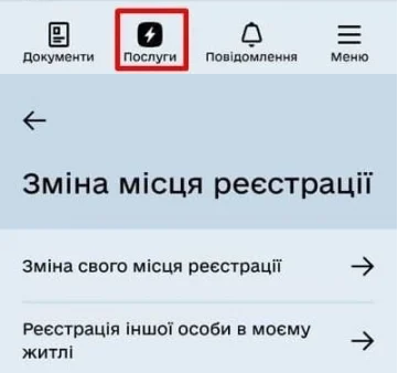Після відкриття програми потрібно вибрати розділ "Послуги" та "Зміна свого місця реєстрації".