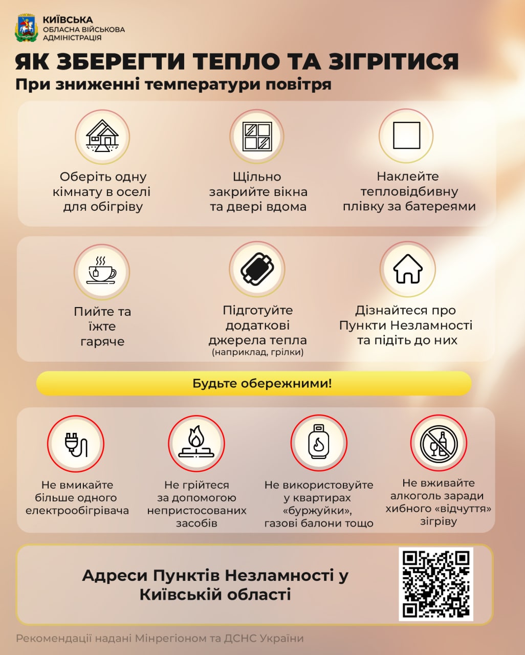 Водночас не забувайте, що у квартирах заборонено використовувати "буржуйки", газові балони й інші непристосовані засоби для обігріву й приготуванні їжі. Крім того, не намагайтеся зігрітися алкоголем, оскільки він дає хибне відчуття "тепла".