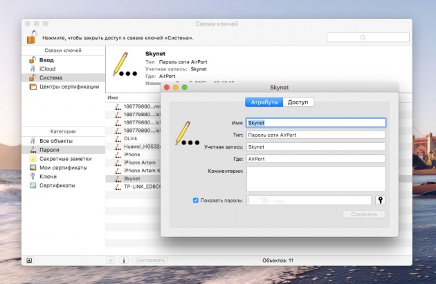 Операційна система OS X зберігає пароль від будь-якої мережі, до якої ви коли-небудь підключалися. Запустіть систему через Spotlight або з папки Програми. Виберіть на бічній панелі зліва розділ "Система". Далі знаходимо потрібну мережу у списку і тиснемо на кнопку "i" на панелі нижче. Ставимо галочку біля "Показати пароль" та після введення пароля адміністратора ви побачите пароль від Wi-Fi.