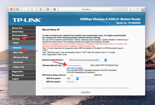 Якщо у вас є доступ до веб-інтерфейсу, пароль роутера можна знайти там. Перейдіть в браузер за адресою 192.168.0.1 (або 192.168.1.1) та введіть логін та пароль. Знайдіть розділ Wireless Network, який містить пункт Security з опціями захисту. У ньому міститься пароль бездротової мережі. Додамо, що пароль за замовчуванням прихований і для відображення його потрібно натиснути кнопку Display password.