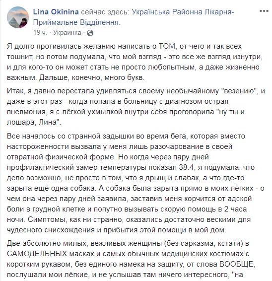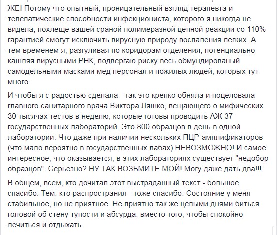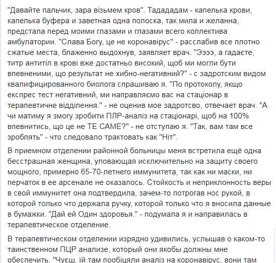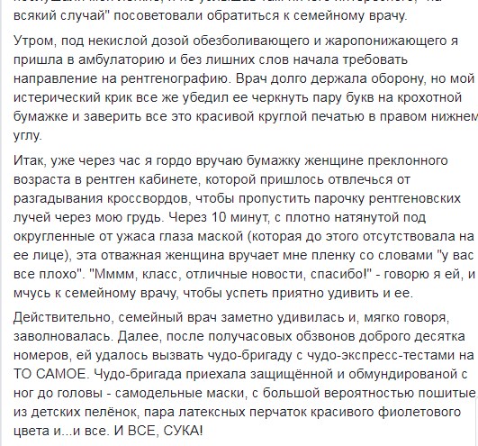 "Далі, після півгодинних обдзвонів доброго десятка номерів, їй вдалося викликати диво-бригаду з диво-експрес-тестами на ТЕ САМЕ. Чудо-бригада приїхала захищеною і в обмундируванні з ніг до голови - саморобні маски, з великою ймовірністю які пошито з дитячих пелюшок, пара латексних рукавичок красивого фіолетового кольору і ... і все. і ВСЕ, *УКА!" - продовжує дівчина.