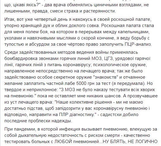 "Розкішна палата стала для мене полем бою, на якому в перервах між крапельницями, уколами і нав'язливими думками про швидку кончину, я веду боротьбу з тупістю і абсурдом за своє чортове право отримати ПЛР-аналіз", - додає жінка.