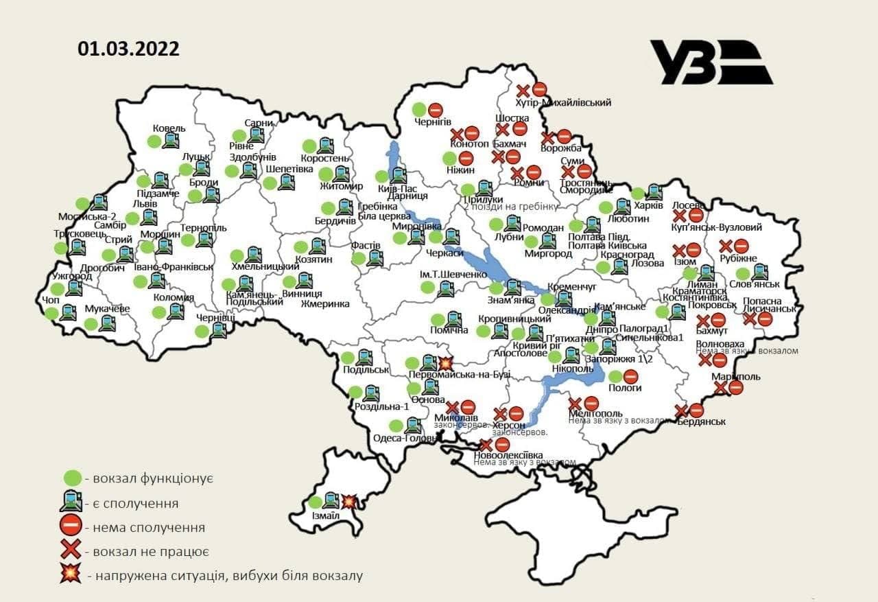 На сході не працюють вокзали у містах: Ізюм, станція Куп'янськ-Вузловий, Рубіжне, станція Попасна-Лисичанськ, Бахмут, Волноваха, Маріуполь, Бердянськ, Пологи, Мелітополь.