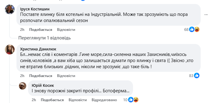 Проте були й ті, хто висловлювався проти. Христина Данилюк пише: "Бл...немає слів і коментарів. Гине море, сила-силенна наших Захисників, чиїхось синів, чоловіків, а вам хіба що залишається думати про ялинку і свята (( Звісно, хто не втратив близьких, рідних, ніколи не зрозуміє, що таке біль!". Її коментар набрав підтримку 83 людей.