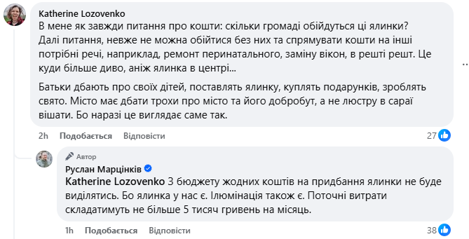 Katherine Lozovenko звернула увагу на питання фінансування: "В мене як завжди питання про кошти: скільки громаді обійдуться ці ялинки? Далі питання, невже не можна обійтися без них та спрямувати кошти на інші потрібні речі, наприклад, ремонт перинатального, заміну вікон, в решті решт. Це куди більше диво, аніж ялинка в центрі… Батьки дбають про своїх дітей, поставлять ялинку, куплять подарунків, зроблять свято. Місто має дбати трохи про місто та його добробут, а не люстру в сараї вішати. Бо наразі це виглядає саме так".