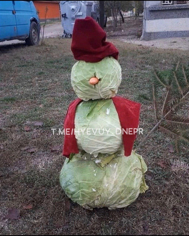 Так, один сніговик був виготовлений з капусти - три овоча просто склали один на інший і накрили шапкою. Також "плечі" капустяного сніговика приховані шарфом, а з отвору в районі "голови" стирчить морква.