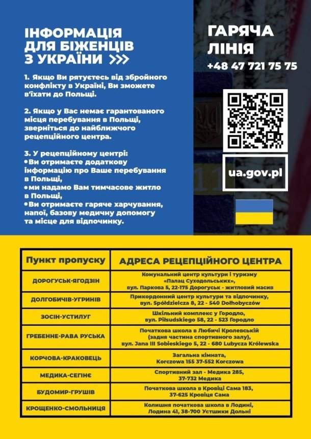 Біженцям з України, які не мають гарантованого місця перебування (місць на ночівлю) у Польщі, потрібно звернутися у рецепційний центр на кордоні чи у якомусь з воєводств Польщі. Там можна одержати всю інформацію про перебування в країні, а також продукти; медичну допомогу та місце для відпочинку. Там же повідомлять про те, де тимчасово поселять. Біженцям передбачений безкоштовний доступ до медицини.