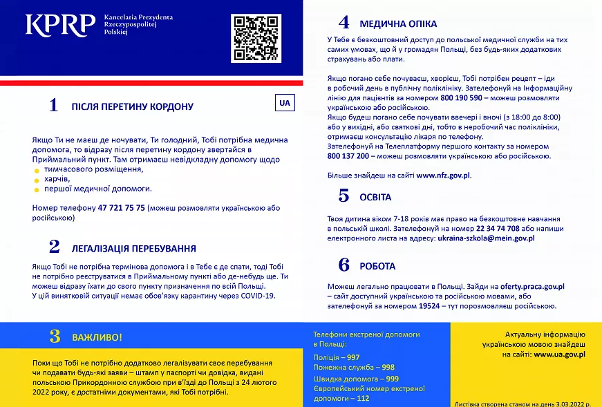 Згідно з ним, громадяни України, які перетинають кордон Польщі у зв'язку з війною, зможуть законно перебувати там 18 місяців. Старт легалізації перебування - 24 лютого, на подання відповідної заяви відведено до 90 днів. Це не стосується осіб з посвідками на постійне та тимчасове проживання, статусом біженця чи додатковим захистом.