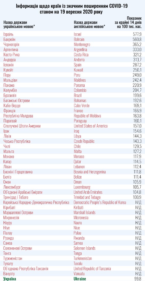 У суботу, 19 вересня, Міністерство охорони здоров'я України оновило список країн "червоної" і "зеленої" зон з урахуванням кількості активних випадків COVID-19 на 100 тисяч населення.