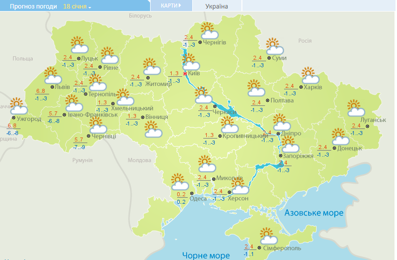 Опадів 18 січня не прогнозують, буде сонячна погода. Вітер східний 5-10 м/с.