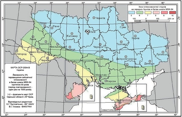 Така різниця спричинена тим, що під час розрахунку конструкцій будинків і споруд, інженери користуються картою України із поділом її території на зони інтенсивностей струсів на середніх ґрунтах, відповідно до якої та згідно зі словами заступника директора Інституту геофізики Національної академії наук України Олександра Кендзера найпотужніші землетруси можуть виникнути на південному заході Одеської області, тоді як більша частина нашої країни розташована в зоні, де максимальні струси можуть бути на рівні 5 балів.