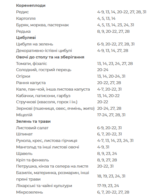 Згідно з місячним посівним календарем городника, загалом такі сприятливі дати для посівів і посадок всіх рослин: 4, 5, 8, 9, 13, 14, 20-24, 27, 28, 31 серпня.