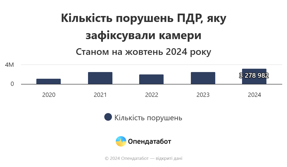 Камери автоматичної фіксації за дев'ять місяців 2024 року виявили понад 3,2 млн порушень правил дорожнього руху. Це в 1,7 раза більше, ніж за аналогічний період минулого року, та рекорд з моменту встановлення камер у червні 2020 року.