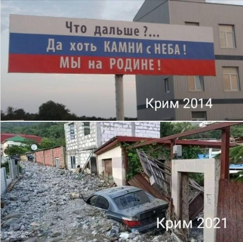 Вона виконана у вигляді колажу - у верхній частині текст білборда, який в 2014 році був встановлений в Криму: "Що далі? Та хоч каміння з неба! Ми на батьківщині!". У нижній частині - фото з машиною в районі Василівка в Ялті, яку засипало тим самим "камінням з неба" і будівельним сміттям, які несло селевим потоком.