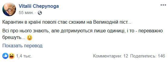 "Карантин в країні поступово стає схожим на Великодній піст ... Всі про нього знають, але дотримуються лише одиниці, та й ті переважно брешуть", - написав користувач Віталій Чепінога.