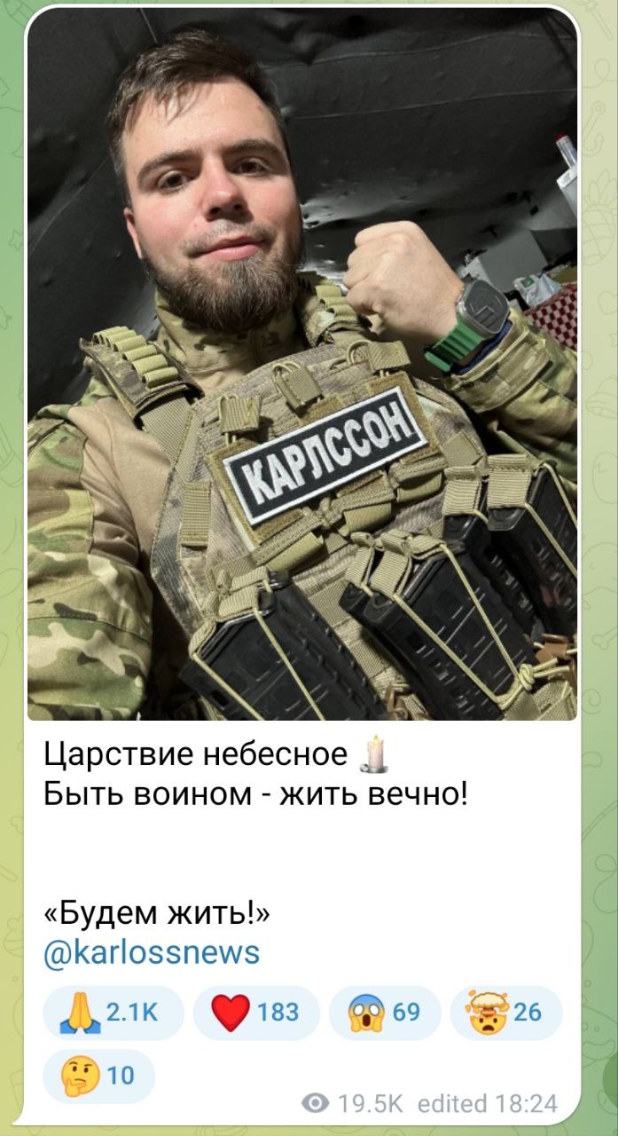 Зазначається, що Карлсон - командир загону БПЛА, який воював у кадировському "Ахматі". Він був ліквідований під Кліщіївкою.