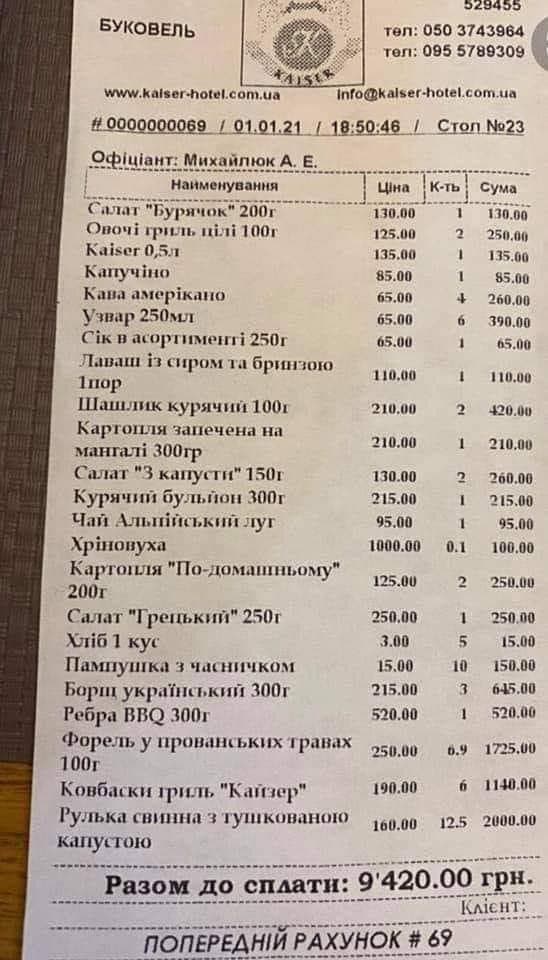 Наприклад, 200 гр салату "Бурячок" там коштує 130 гривень, картопля на мангалі - 210 гривень за 300 гр, а борщ - 215 гривень за 300 гр. За чашку капучіно просять 85 гривень. Найдешевша позиція в меню - шматок хліба (3 гривні), а найдорожча - хреновуха (1000 грн). Загальний рахунок у чеку склав 9 420 грн.