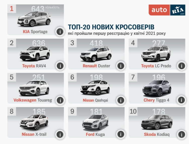 На першому місці виявився KIA Sportage, в квітні українці купили 643 новеньких авто, ціна від $19 207. На другому місці - Тoyota RAV4 - 636 проданих авто.