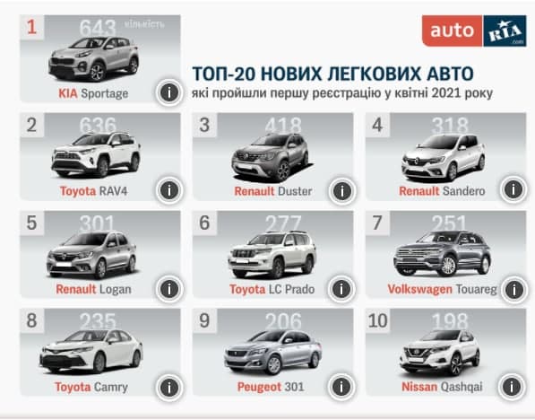 У квітні 2021 року в Україні встановлено рекорд продажів нових легкових авто - число нових зареєстрованих автівок сягнуло 10,3 тис. Автомобільні експерти за підсумками продаж склали рейтинг найпопулярніших в Україні легкових автомобілів.