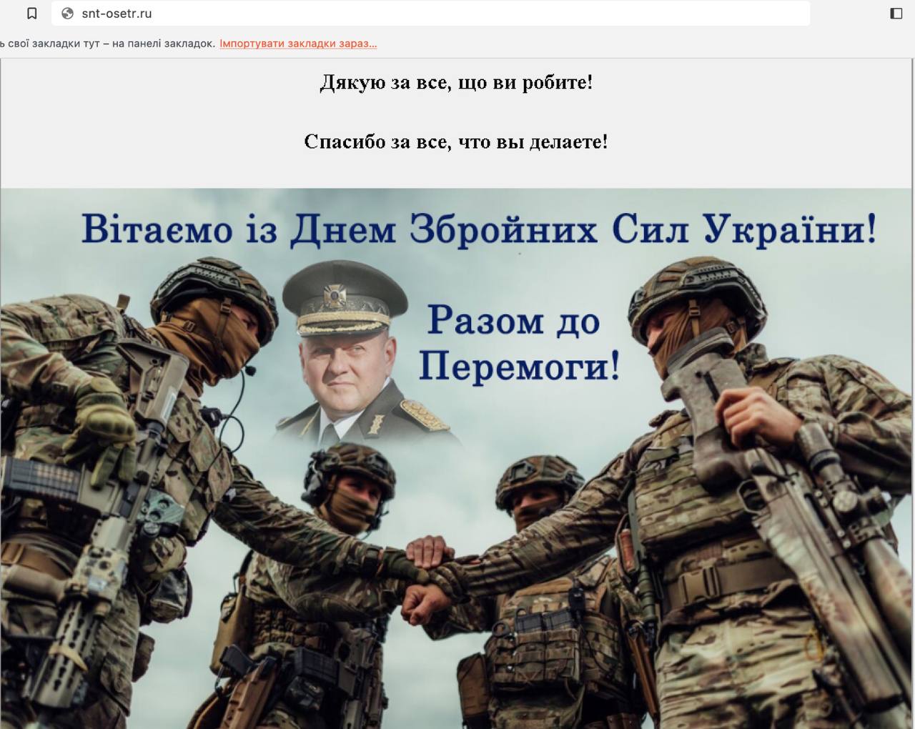 На сайтах трьох російських компаній з'явилася фотографія з Залужним в оточенні українських вояків і вітальним написом.