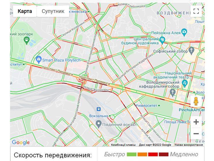 Ускладнений рух на Набережному шосе у бік бульвару Дружби народів. На вулиці Набережно-Хрещатицькій. Серйозний затор на проспекті Перемоги від. м Політехнічний інститут у бік центру. Затор та тягнучка біля. м Лук'янівська на вул. Ю.Іллєнка у бік центру. Затор на Кудрявському узвозі. Тягнучки на вулиці Глибочицькій. Затори утворилися на Голосіївському проспекті у бік м. Виставковий центр. Ускладнений трафік біля. м. Васильківська, м. Іподром (на пр. Глушкова у бік центру). Водії стоять у заторі на вул. Палладіна, частково на Великій Кільцевій дорозі.