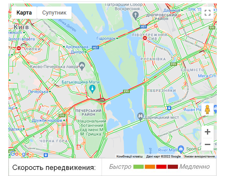 Затори та тягнучки спостерігаються біля станції метро "Чернігівська". Ускладнений проїзд авто біля м. "Дарниця" і далі на Броварському проспекті у бік Русанівського мосту (особливо на в'їзді та з'їзді). Перевантажений рух на проспекті Соборності, біля та на мосту Патона (особливо на в'їзді та з'їзді). На в'їзді на Південний міст – тягучка. На Гаванському мосту – пробка.