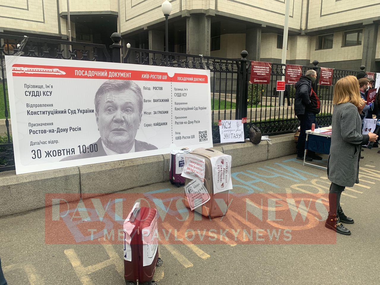 Нагадаємо, що під час акції суддям Конституційного суду під будівлю принесли "посадковий квиток" і валізи для переїзду в Ростов до Януковича.