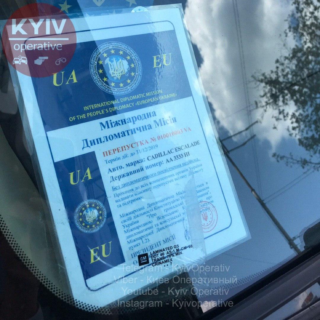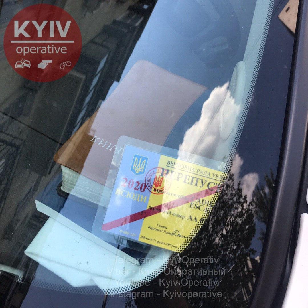 Як видно на знімках, на лобовому склі автомобіля, який припарковано не за правилами, прикріплено також пропуск до Верховної Ради і прострочений пропуск від "Міжнародної дипломатичної місії".