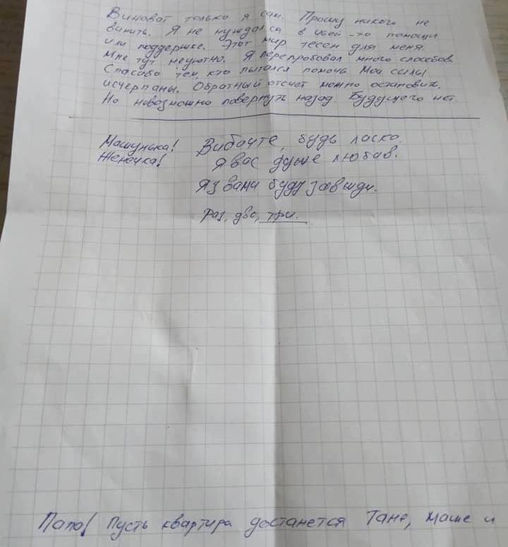 У розмові Віталій зізнався, що хотів, аби поліціянти його застрелили. Тому і напав на їх колегу. Сенсу продовжувати життя не бачить і, навіть, вже опублікував у Facebook передсмертну записку.