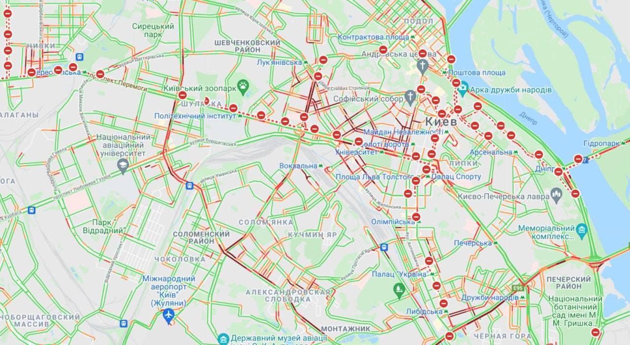 А також Велика Окружна дорога, проспект Героїв Сталінграда, Оболонський проспект, проспект Науки, проспект Степана Бандери, бульвар Тараса Шевченка. Ускладнений рух Південним мостом.