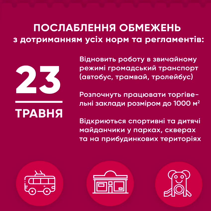 - відкриються спортивні та дитячі майданчики в парках, скверах та на прибудинкових територіях.