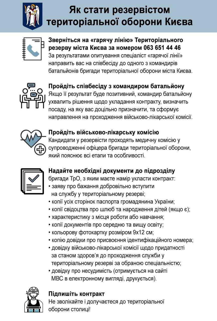 Київська міська державна адміністрація надала алгоритм дій щодо того, як стати резервістом територіальної оборони.