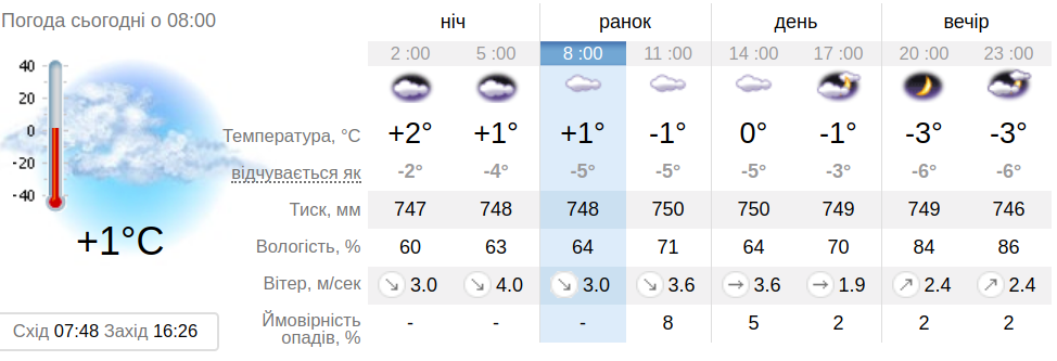 Стовпчик термометра вдень у Києві не підніметься вище за 0 °C. Вранці і до 14:00 буде мороз до -1°C, а обід повітря прогріється до нуля. Після заходу сонця о 16:26 температура почне падати до -3°C і протримається до пізньої ночі. Протяг дня температура відчуватиметься в межах від -5°C до -3°C.