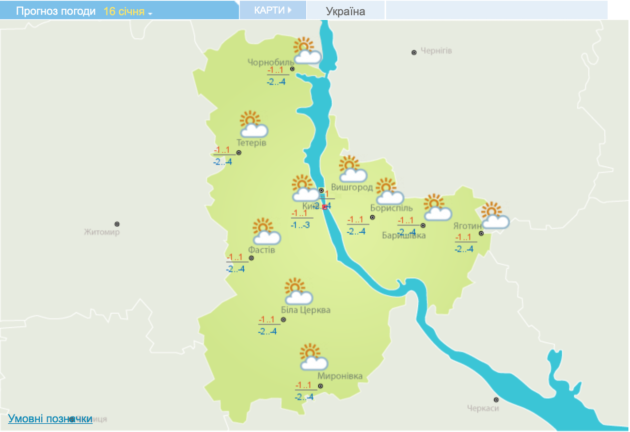 У неділю, 16 січня, у Києві прогнозують хмарну погоду протягом дня без опадів.