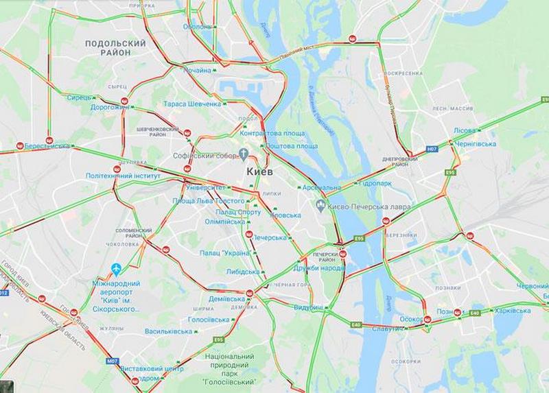 Судячи з опублікованими даними, великі скупчення машин утворилися на всіх мостах в напрямку правого берега. У пробках стоять автомобілі на Набережному шосе, проспекті Перемоги і вулиці Олени Теліги.