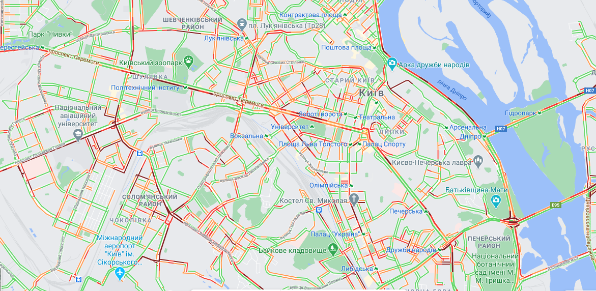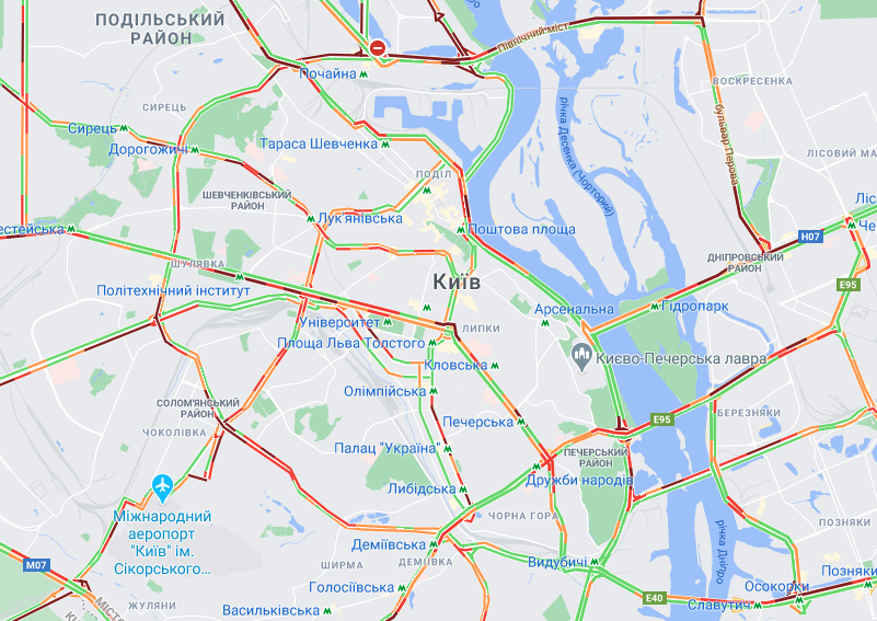 Пробки скувала Брест-Литовське шосе в напрямку Києва, проспект Перемоги до Берестейської. Тягнучки спостерігаються на проспекті Перемоги від Шулявської і до центру міста.