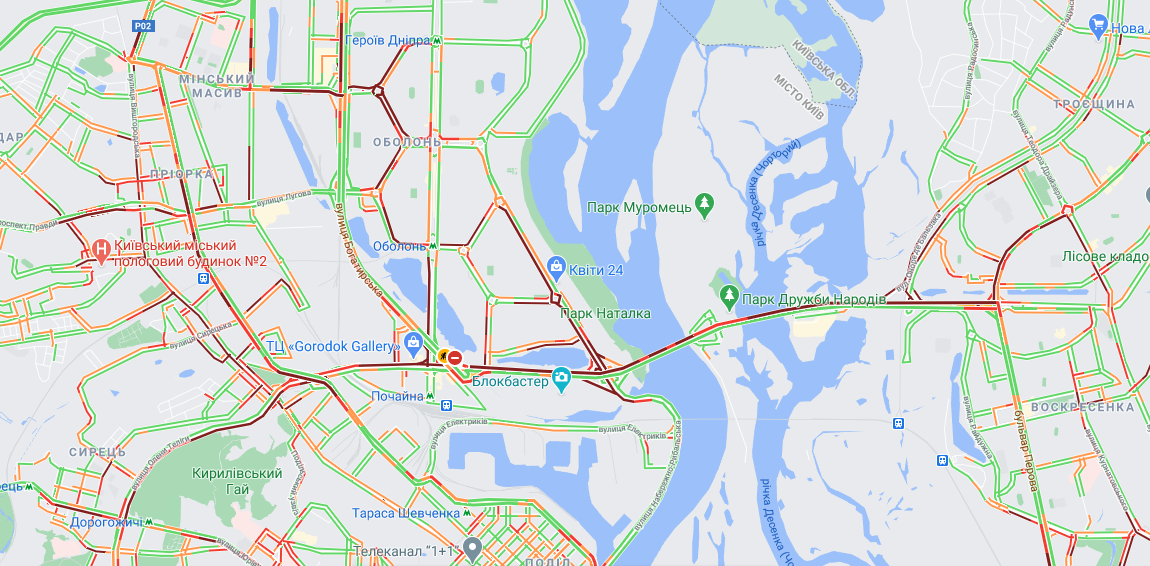 Дуже важко виїхати з Троєщини. Проспект Шухевича коштує майже по всій довжині до Північного моста. Пробка виникла на з'їзді з вулиці Оноре де Бальзака. Також зупинився і проспект Маяковського - проблеми починаються ще в районі вулиці Миколаєва. Не проїхати і по вулиці Драйзера між Маяковського і Шухевича.