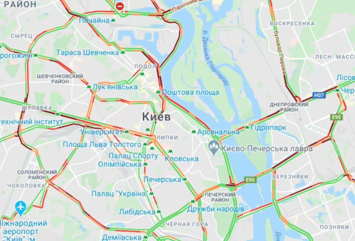 Ще одна велика пробка утворилася на Набережному шосе і кілька дрібніших біля станції метро "Почайна" і "Героїв Дніпра".