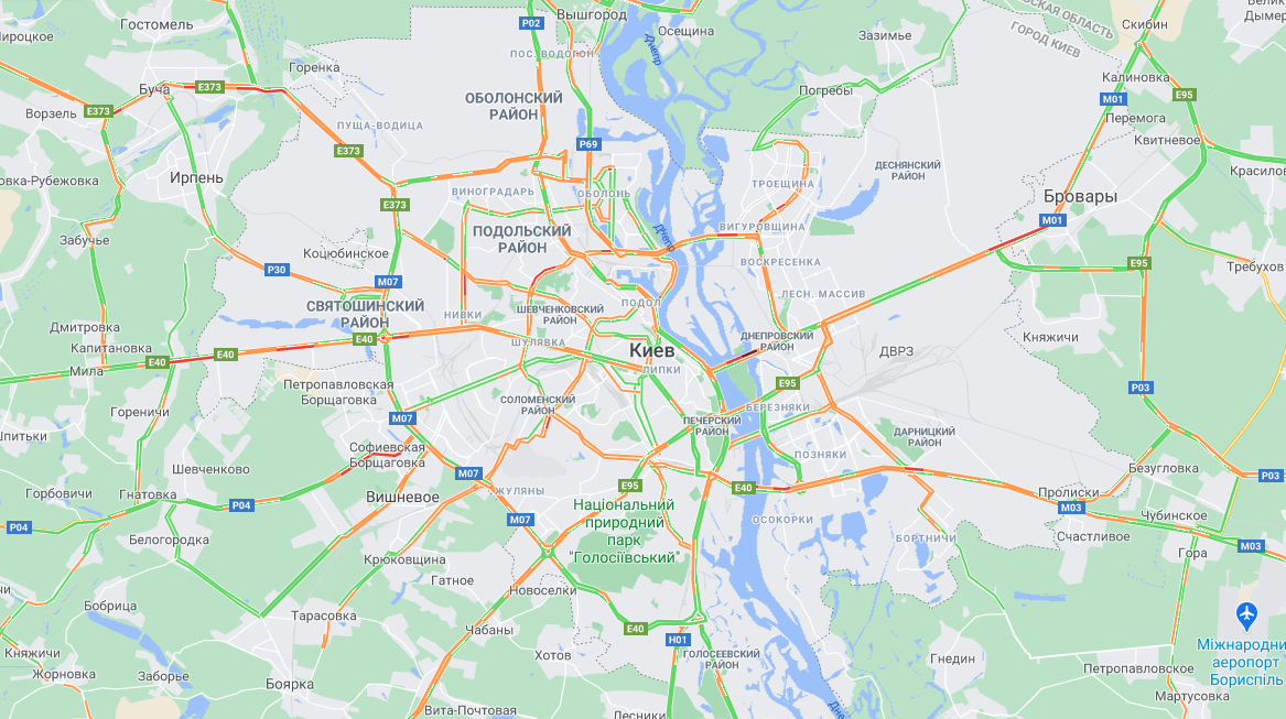 Ускладнено рух майже на всіх в'їздах у місто: затори утворилися на під'їздах з боку Бучі, в Софіївській Борщагівці, в Броварах і Борисполі.