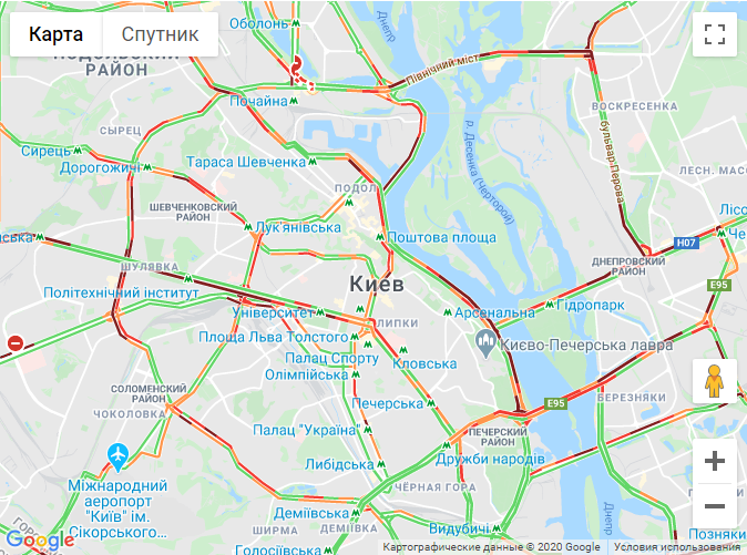 Станом на 09:45 затори виникли на всіх мостах через Дніпро, в напрямку правого берега. Також частково стоїть проспект Перемоги, бульвар Тараса Шевченка. Великий затор на Набережному шосе і на Подолі.