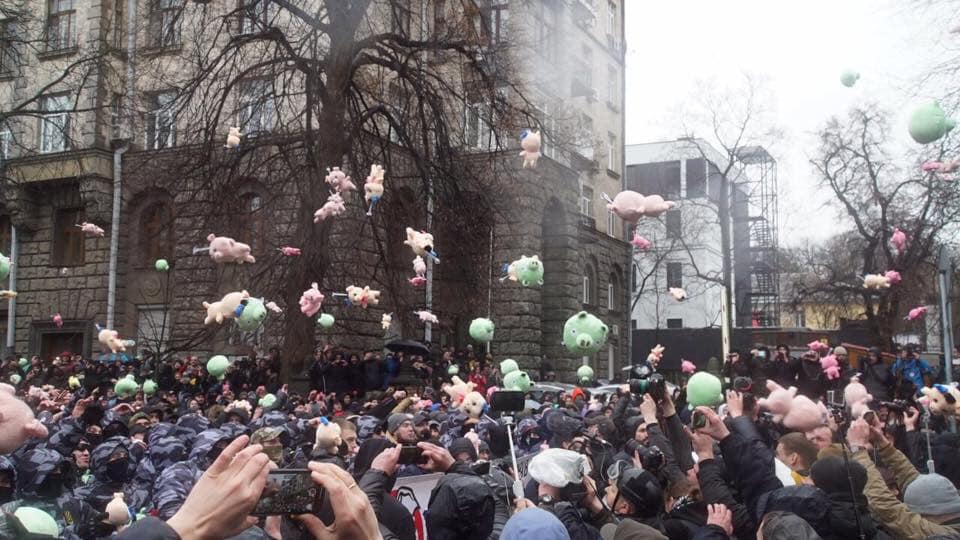 В ході час акції під адміністрацією президента учасники скандували "Свинарчук за ґрати!" і "обстріляли" АП з імпровізованої рогатки іграшковими свинями.