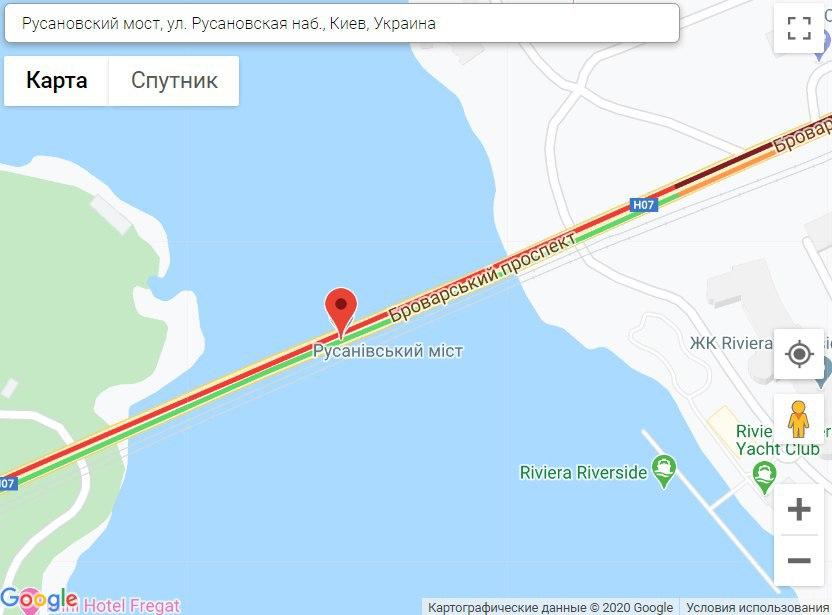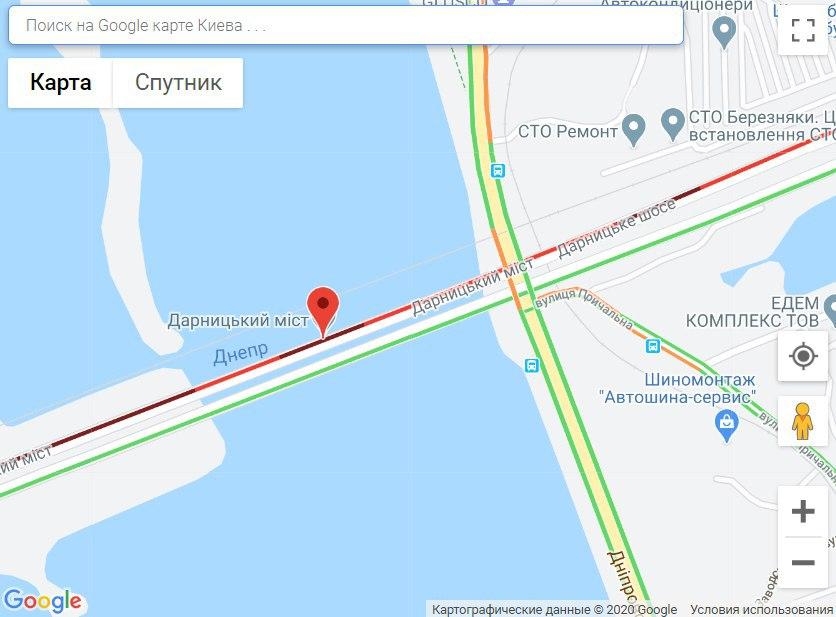 Як видно на карті, мости через Дніпро в Києві завантажені транспортом.