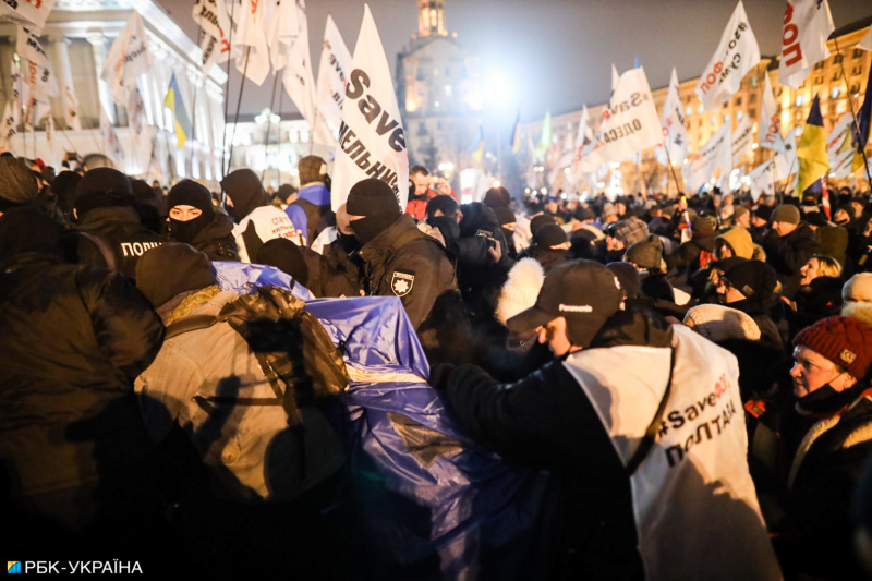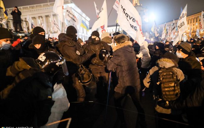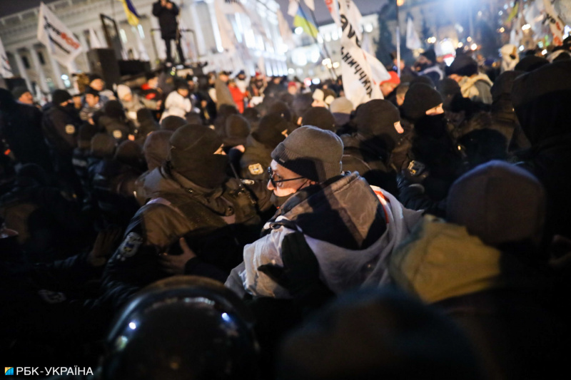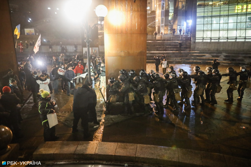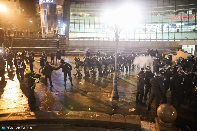 Після того, як правоохоронці почали забирати намети, протестувальники почали кидати в їхній бік палиці, петарди та інші предмети, а також знімати з силовиків каски. Поліція застосувала в сторону учасників акції сльозоточивий газ.