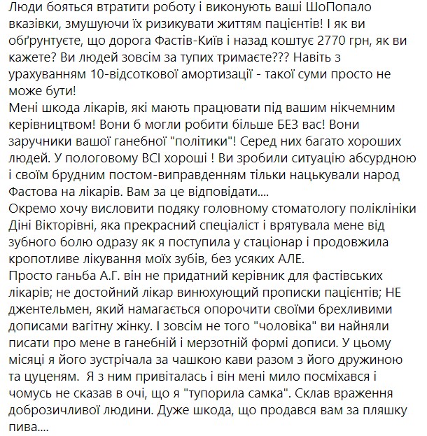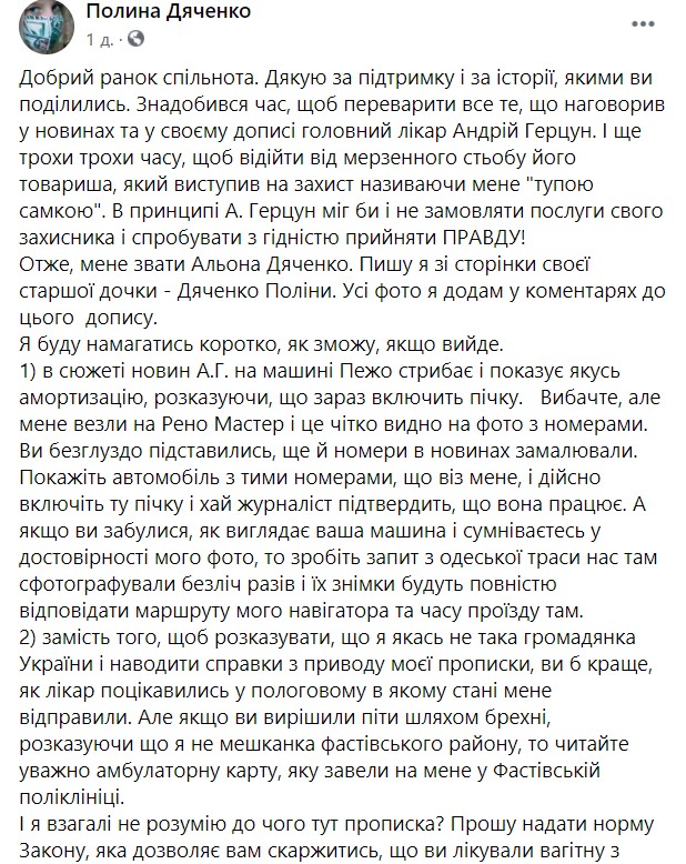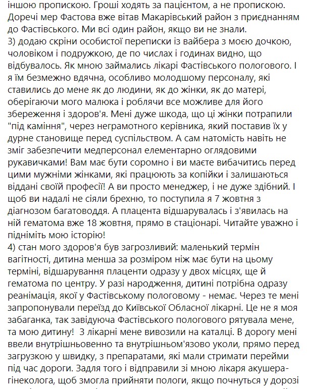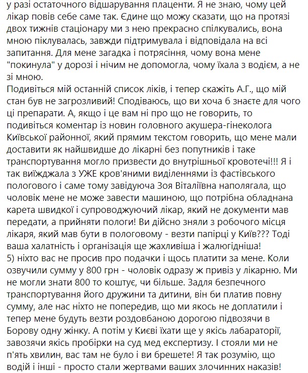"Замість того, щоб розповідати, що я якась не така громадянка України і наводити довідки з приводу моєї прописки, ви б краще, як лікар поцікавилися в пологовому будинку в якому стані мене відправили. Але якщо ви вирішили піти по шляху брехні, розповідаючи що я не жителька Фастівського району, то читайте уважно амбулаторну карту, яку завели на мене в Фастівській поліклініці", - пише вона.