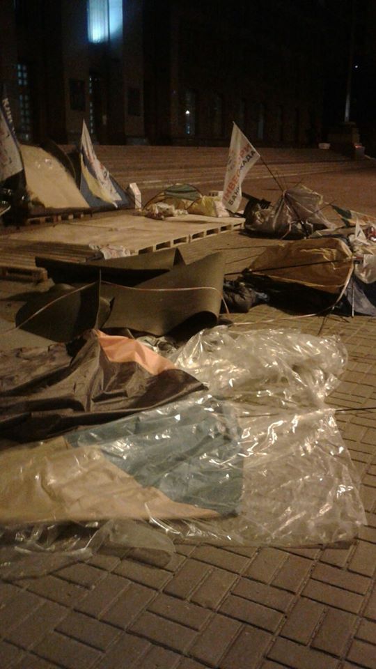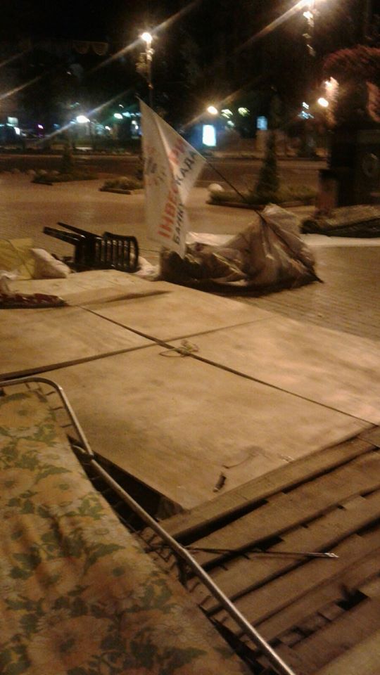 Відзначають, що зламано каркаси наметів, порвані тенти, навпіл зламано вудки до прапорів, розкидані каремати, спальники та банери.