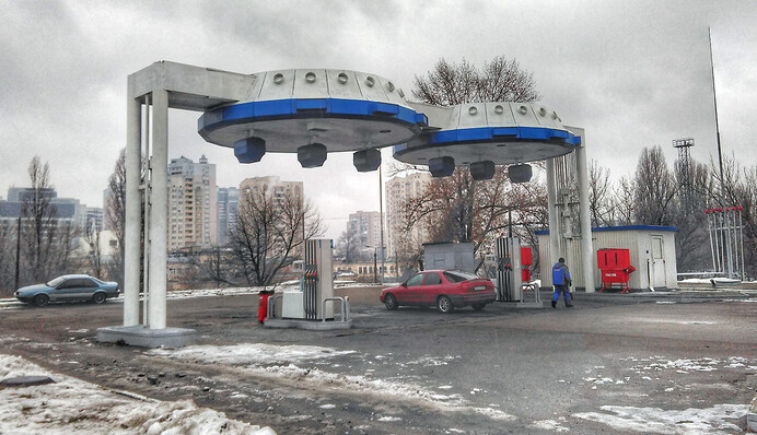 У 1970-х роках у Києві побудували кілька футуристичних автомобільних заправок у вигляді тарілок НЛО.