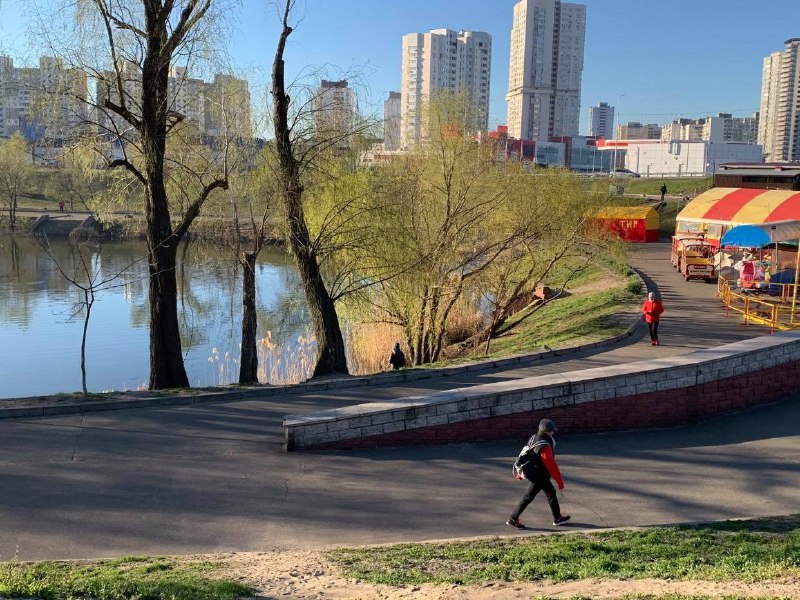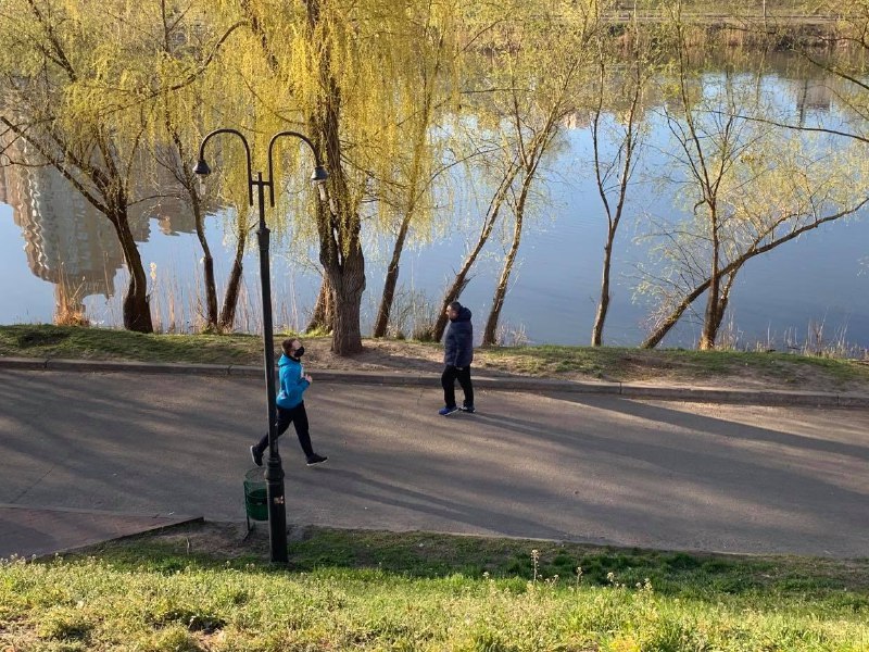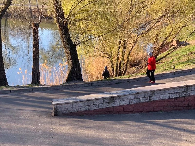 Українці як і раніше продовжують жити своїм життям: гуляють, їздять на роботу, а також влаштовують пробіжки в парках. Так, наприклад, людно в парку поруч з метро Позняки в Києві.