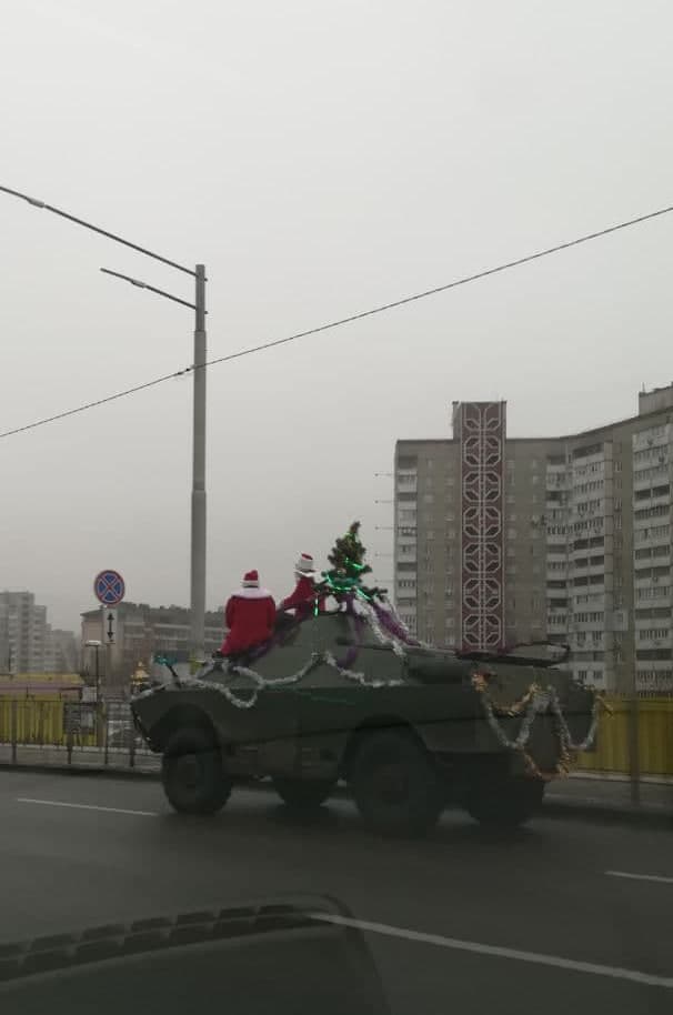 На прикрашеному новорічними гірляндами і ялинкою бронеавтомобілі вулицями столиці їхали два Діди Морози при повному "екіпіруванні". Святкову броньовану розвідувально-дозорну машину (БРДМ) помітили на Кільцевій дорозі.