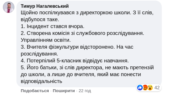 У соціальній мережі Facebook з'явилися цікаві коментарі користувачів. Місцеві жителі пишуть про те, що на вчителя, який просто стояв і дивився, як старшокласники знущаються над школярем, протягом десяти років надходять скарги від учнів і батьків.